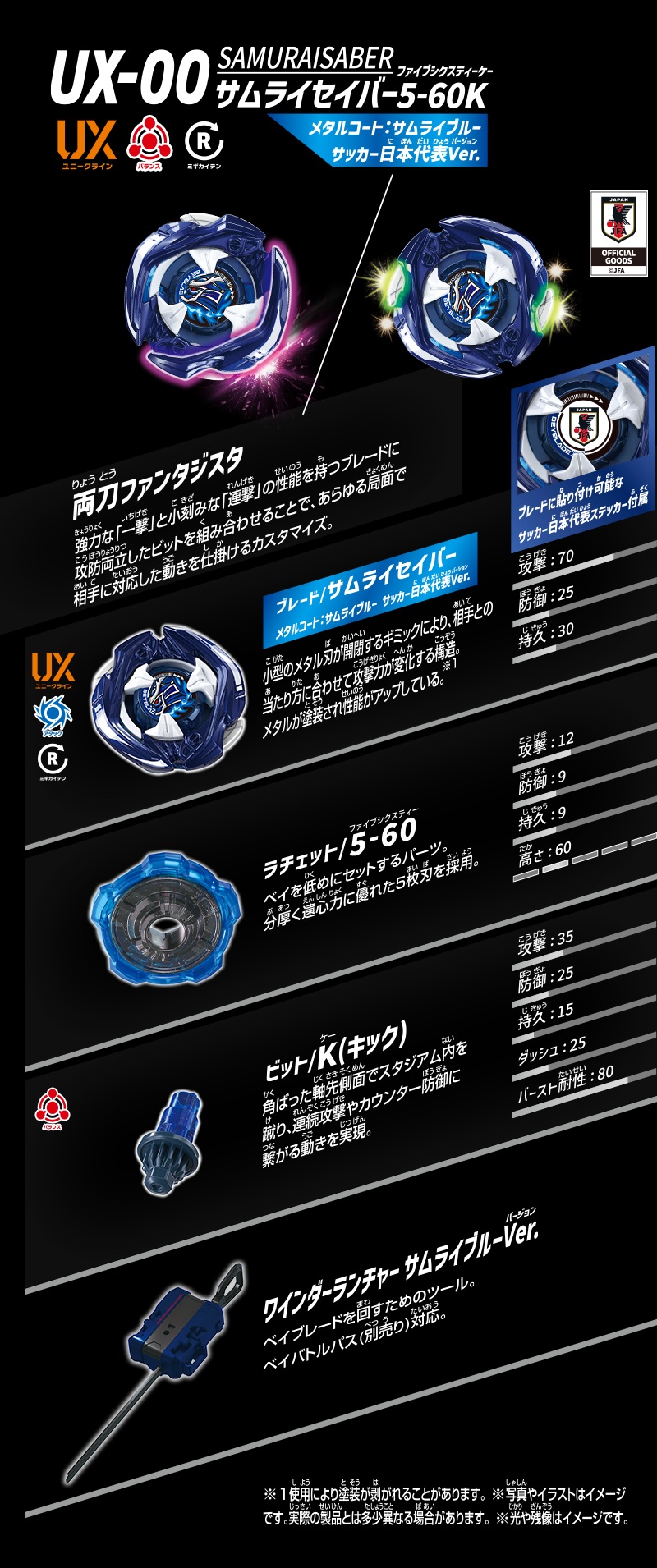 | Product Name : | BEYBLADE X Starter UX-00 SAMURAISABER 5-60K Metal Coat: Samurai Blue Japan National Football Team Ver. (PRE-ORDER) |